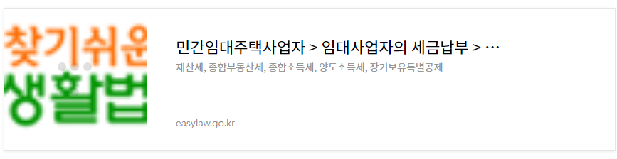 장기민간임대사업자 등록을 하는 경우 임대주택에 대한 재산세를 50~100% 감면받을 수 있습니다. 뿐만 아니라 종합부동산세 계산시 임대주택은 과세표준에서 합산배제 혜택을 받을 수 있습니다. 소형주택 임대사업자에 대한 종합소득세 세감면과 양도소득세 감면, 취득세 감면까지 있어 여러모로 세제혜택이 많습니다. 자세한 내용이 궁금하신 분들은 아래 법제처 민간임대주택제도 안내 바로가기를 참고하시면 자세한 법령과, 카드뉴스 등을 확인하실 수 있으니 참고해주세요.
