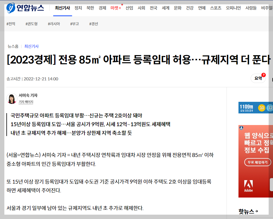 수도권 부동산 경기가 엄청 침체되어있었던 2022년 말쯤 아파트도 국민평수 이하는 민간임대사업자 등록으로 혜택을 받을 수 있도록 국토부가 부활시킬 예정이라는 경제신문을 본 적이 있는데, 이후로 그에대한 언급이 없어서 직접 확인해보았습니다. 먼저 그당시 배포되었던 주요 언론사 기사를 살펴보겠습니다.