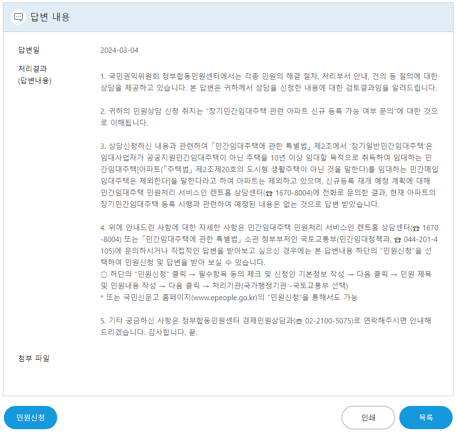 2024년 3월 4일 국민권익위원회 정부합동민원센터 경제민원상담과 답변