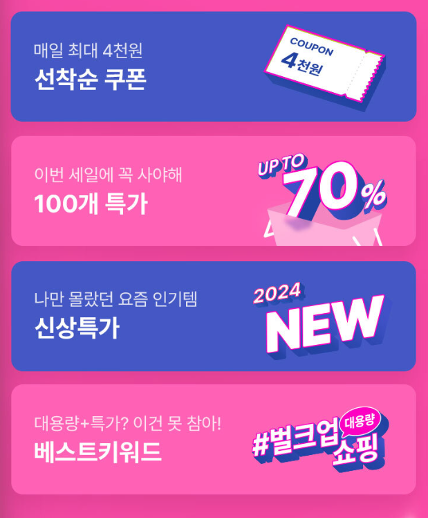 2024년 신상품 특가세일과 대용량 벌크업 세일도 진행된다고 하니까 자주 사용하시는 제품이 세일을 하는지 확인해보시면 저렴하게 득템하실 수 있을 것 같습니다.