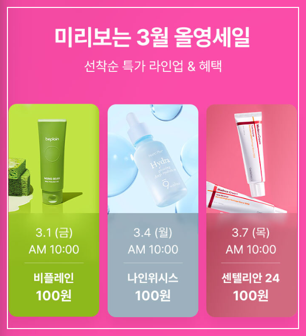 내일부터 매일 오전 10시 선착순 100원 특가가 진행됩니다. 미리 예고된 품목은 아래 세가지인데, 비플레인 팩이 엄청 유명한데 100원이라니 꼭 도전해봐야겠습니다.