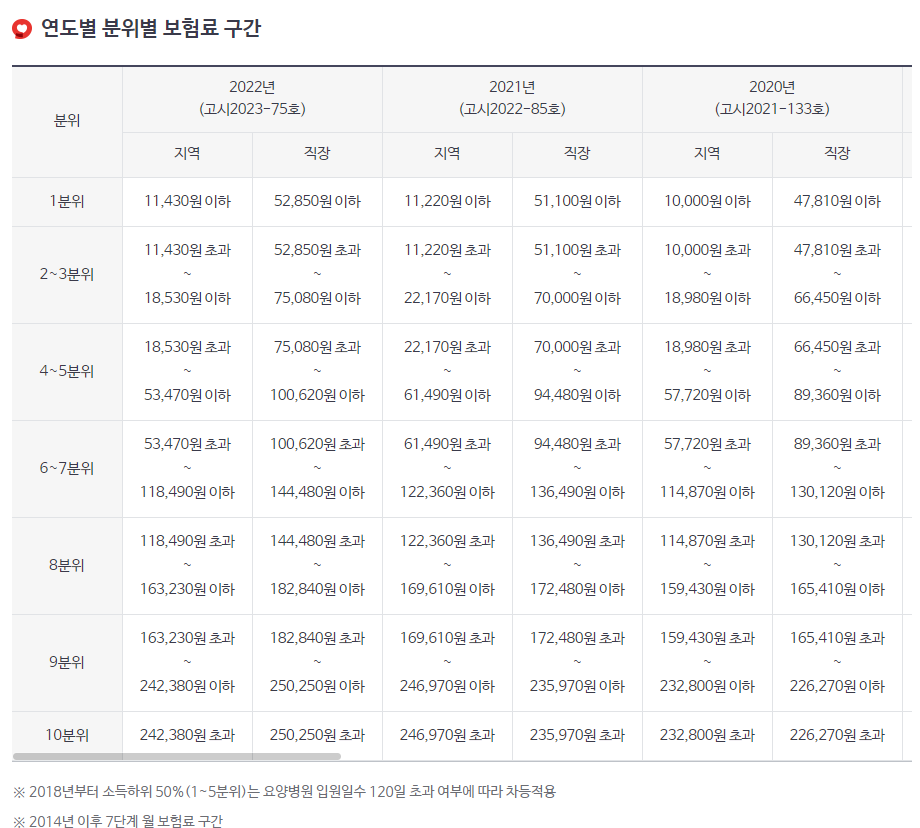 최근 소득분위는 학자금대출용으로 나온 것 밖에 없고 건강보험공단에서는 2022년 까지의 분위별 건강보험료 구간을 제공하기 때문에 참고용으로 아래표를 이용하시면 될 것 같습니다. 보시다시피 연도별로 금액차이가 크지 않습니다.