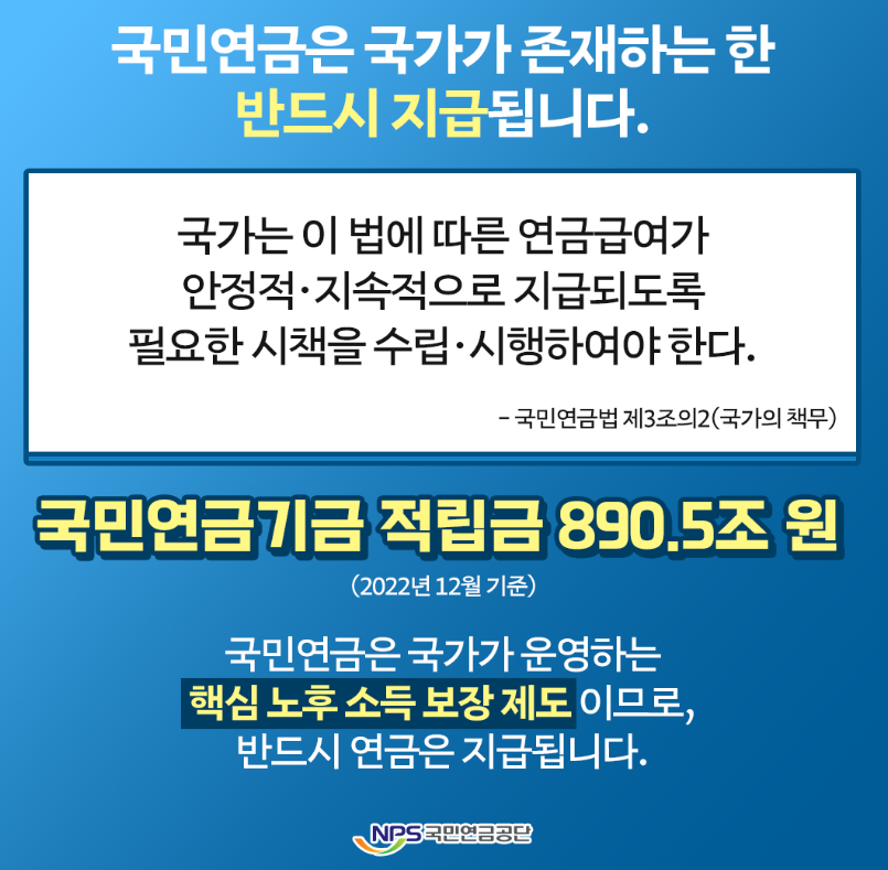 * 국민연금은 가입기간이 10년 이상이면 상기 표에서 확인되는 출생연도별 지급 시작 나이 이후부터 평생 받을 수 있습니다.