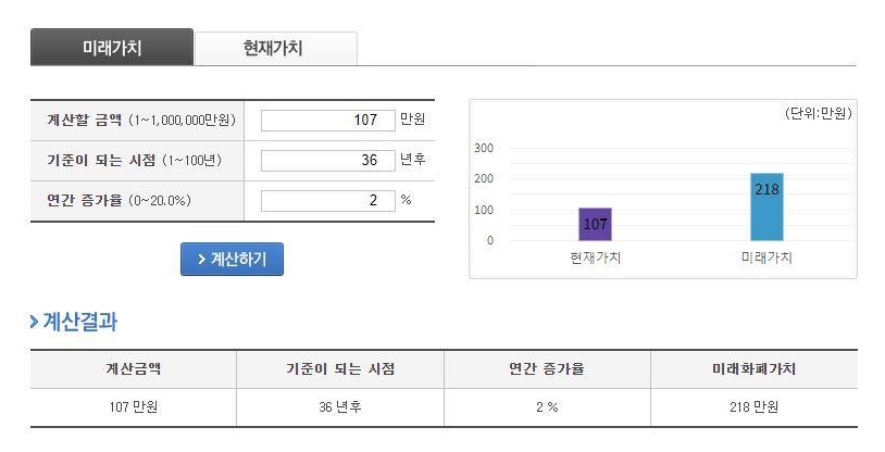 국민연금은 매년 1월, 전년도 물가변동비율을 반영해서 연금의 실질가치를 보장해 줍니다. 그래서 예상 연금액 조회 서비스에서 확인한 현재의 예상 연금액을 그대로 받는 것이 아니고, 연금이 지급되는 시점의 (미래) 화폐 가치에 따라 수령하는 금액이 달라질 수 있다고 합니다. 그래서 예상연금액 조회 서비스에서 <화폐 미래가치 조회 서비스>를 이용하시면 현재의 예상수령금액이 미래에는 얼마가 될지 미리 확인이 가능하다고 합니다.