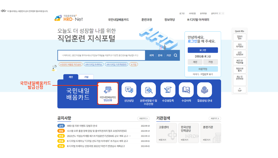 고용노동부에서는 국민들의 직업능력개발훈련을 돕기 위해 훈련비 등을 국비로 지원하는 국민 내일 배움 카드 제도를 운영하고 있습니다. 최대 500만원까지 국비 지원을 받을 수 있는 제도를 놓치면 너무 아깝겠죠? 카드 한장으로 취업, 이직, 창업 등에 필요한 역량을 개발할 수 있는 내일 배움 카드 어떻게 받을 수 있는지 알려드릴게요. 온라인 카드신청으로 바로 이동하실 분들은 아래 바로가기를 참고하시면 됩니다.