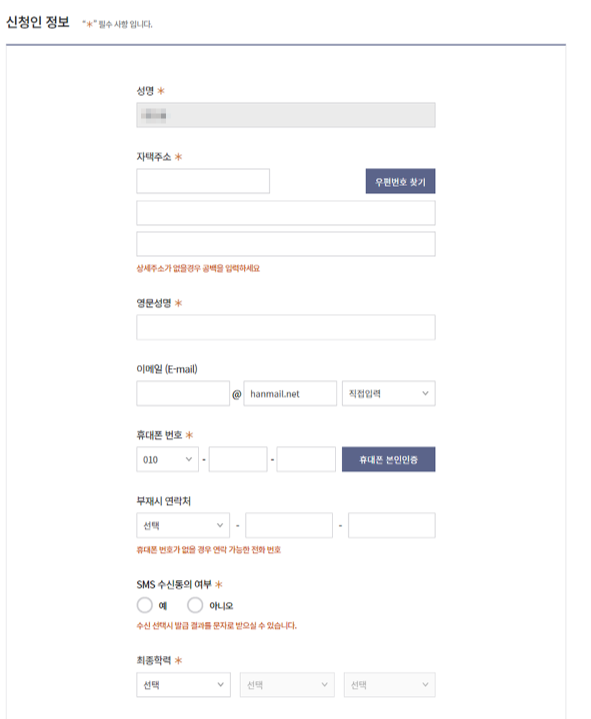 - 신청서 인적사항을 작성합니다.