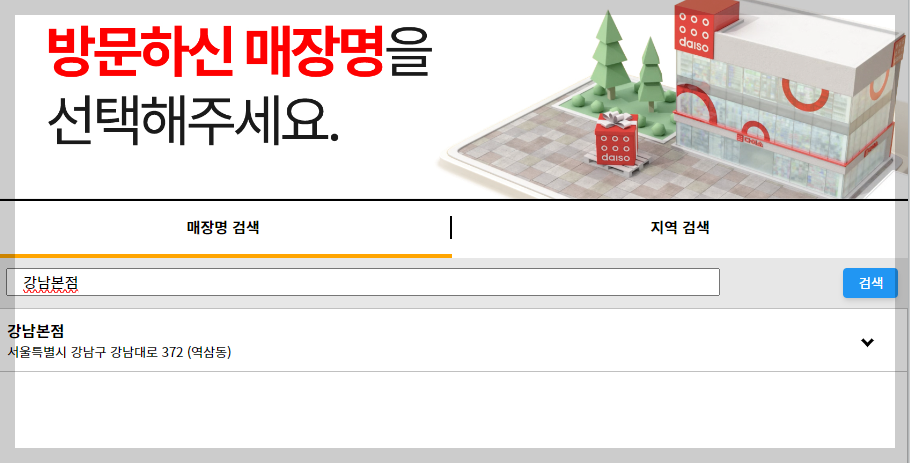위의 바로가기 사이트에 방문하시면 위치정보 활용동의 팝업이 뜰텐데, 위치정보를 제공하면 인근 다이소 매장이 모두 나오는데 위치정보 제공을 원하지 않으시는 경우에는 매장명을 직접 입력하셔서 조회하실 수 있습니다.