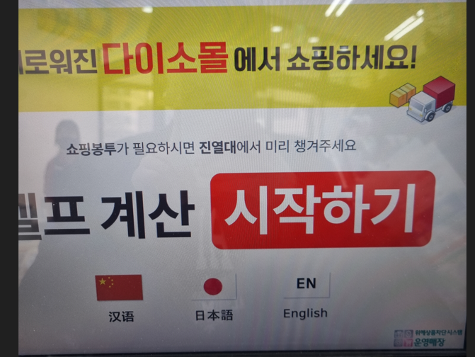 1. 먼저 셀프계산 시작하기 버튼을 눌러줍니다. 버튼을 누르면 이마트나 홈플러스는 바로 멤버쉽 번호등록이나 상품 바코드를 찍으라는 화면이 나오지만 다이소는 결제방식을 선택하는 화면이 먼저 나옵니다.
