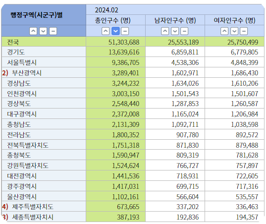2024년 2월 기준 대한민국 인구 정보