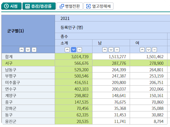 좀 더 자세히 시군구별 인구수를 살펴보면 면적이 넓고 김포와 가까운 인천 서구 인구가 56만 명, 남동구 52만 명, 부평구 50만 명, 미추홀구 41만 명, 송도신도시가 있는 연수구의 인구는 40만 명입니다. 구체적인 인구수는 아래 표를 참고해 주세요.