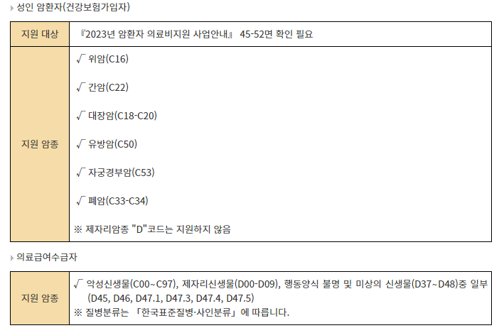 - 지원 암종 및 소득과 재산기준은 아래 표를 참고하시기 바랍니다. (출처 알기쉬운 생활법령정보)