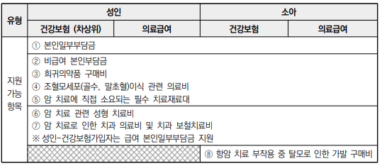 | 소아암 환자 (백혈병 이외의 암종) | 해당 연도 본임부담 진료비 중 최대 2천만원 (다만, 조혈모세포 이식시 3천만원까지) |