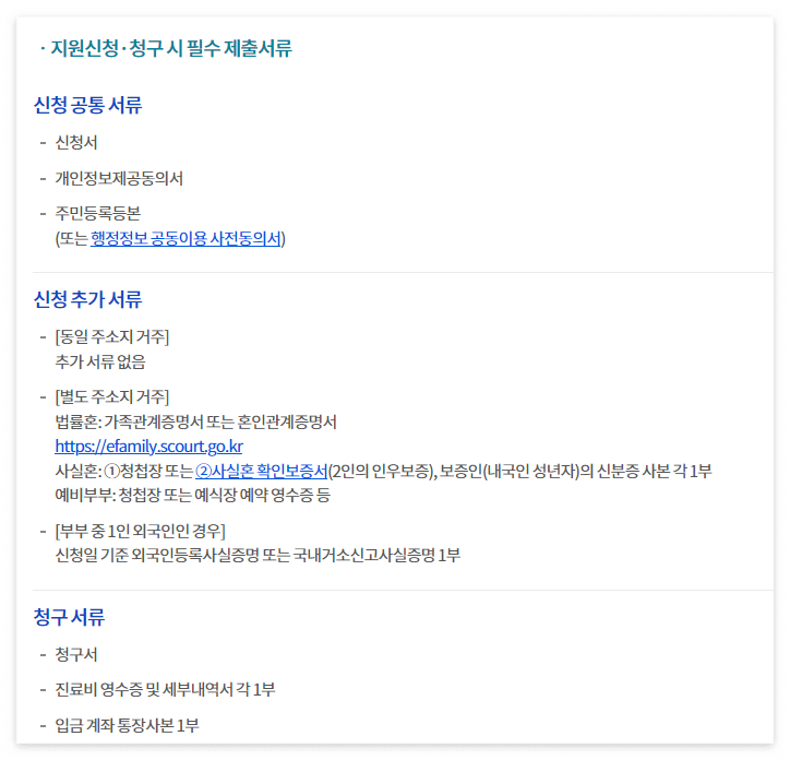 청구서, 진료비영수증 및 진료비 세무내역서 각 1부, 입금계좌 통장사본