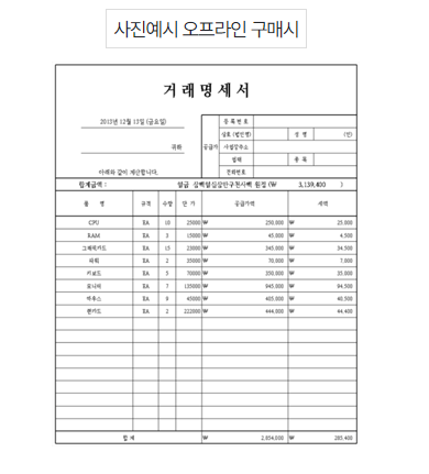 - 거래내역서에는 구매자 성명, 품목, 모델명, 상호(사업자번호), 구매금액, 구매일자, 직인 등이 포함되어야 합니다.