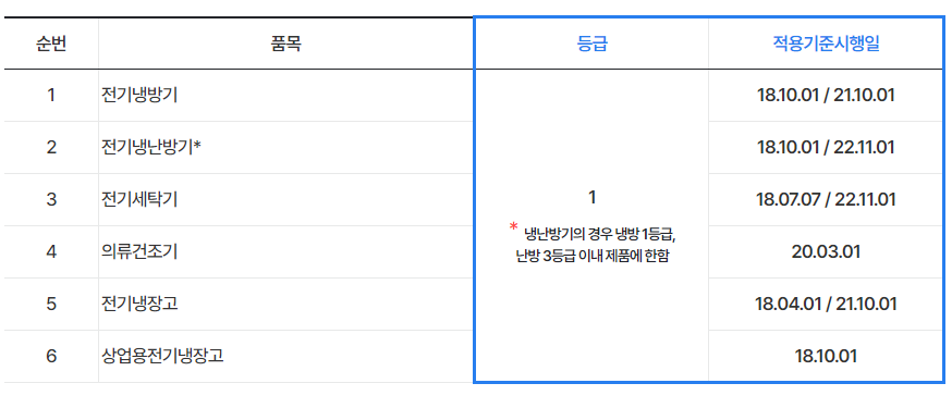 - 아래 6가지 가전제품 품목에 해당되며, 에너지 소비효율 등급과 적용기준 시행일을 모두 충족하는 제품만 해당됩니다.