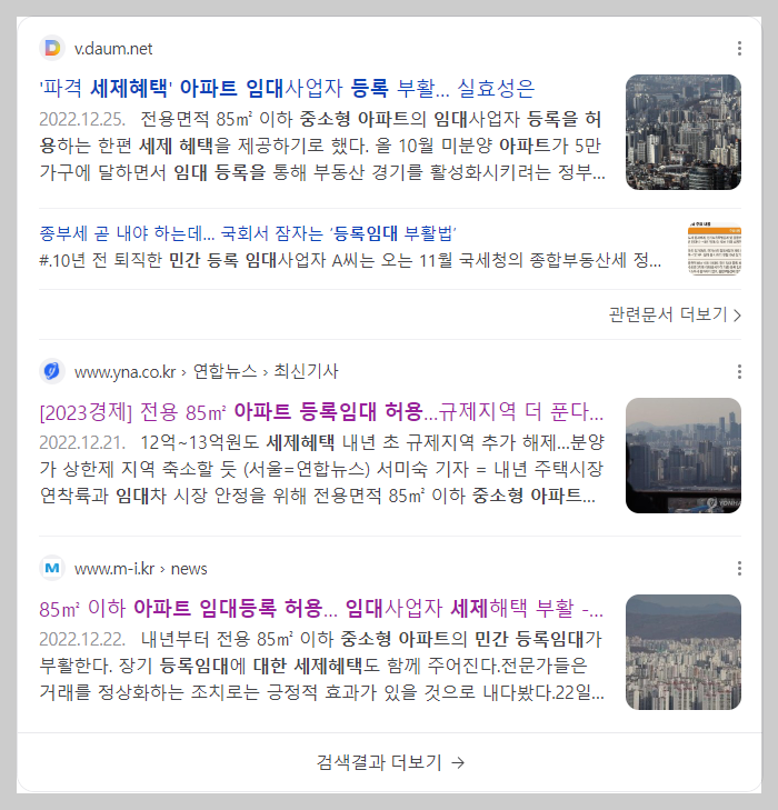 수도권 부동산 경기가 엄청 침체되어있었던 2022년 말쯤 아파트도 국민평수 이하는 민간임대사업자 등록으로 혜택을 받을 수 있도록 국토부가 부활시킬 예정이라는 경제신문을 본 적이 있는데, 이후로 그에대한 언급이 없어서 직접 확인해보았습니다. 먼저 그당시 배포되었던 주요 언론사 기사를 살펴보겠습니다.