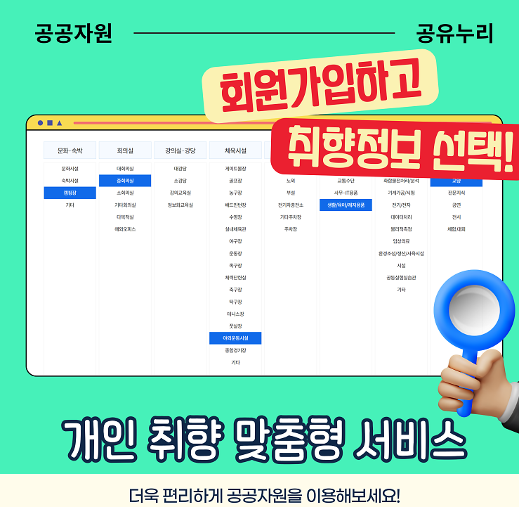 즉 캠핑장이나 숙소 예약 뿐만 아니라 운동시설, 교육, 문화시설 등을 예약할 수도 있고 심지어 캠핑용품과 3D 프린터를 대여해 주는 지역도 있으니 필요하셨던 분들은 공유누리에서 알아보시면 저렴하게 이용하실 수 있습니다. 특히 새롭게 도입관 개인 맞춤 설정기능을 이용하면 더욱 편리하게 조회할 수 있다고 합니다.