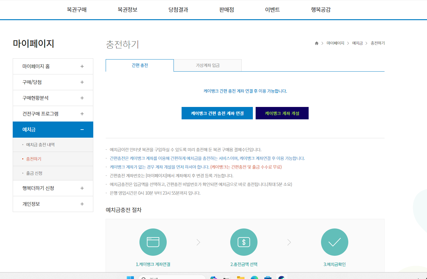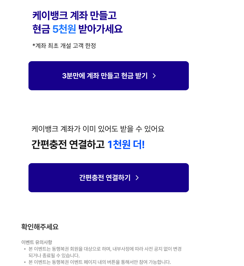 저는 케이뱅크 계좌를 이미 가지고 있었기 때문에 케이뱅크 간편 충전계좌 연결 버튼을 눌렀습니다. 계좌가 없으신 분들은 오른쪽에 계좌 개설을 누르셔서 계좌를 먼저 만들어 주셔야 합니다.