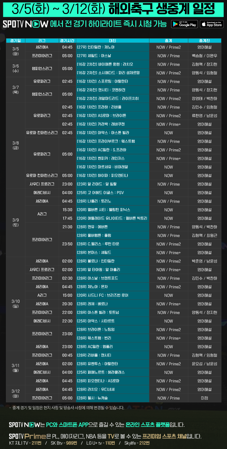 3월 5일부터 3월 12일까지 해외축구 생중계 일정입니다.
