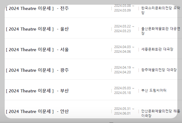 2024년 이문세 콘서트 일정이 나왔습니다. 2024년 3월 3일 전주를 시작으로 울산, 서울, 광주, 부산, 안산에서 2024년 6월1일까지 공연이 진행될 예정입니다. 작년에는 제주도에서도 콘서트를 하셨던 것 같은데 이번에는 제주도는 빠져있어서 아쉽습니다. 이미 대부분의 좌석이 매진될만큼 인기가 대단한데요, 빠르게 예매하러 가실 분들은 아래 링크를 클릭하시면 바로 인터파크 예약페이지로 이동하실 수 있으니까 참고하세요.