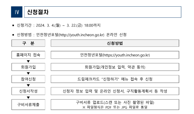 신청기간인 2024년 3월 4일 월요일부터 3월 22일 금요일까지 인천청년포털에서 온라인으로 신청이 가능합니다. 신청을 위해서는 홈페이지 회원가입이 필수이며, 신청하실때 청년드림통장과 헷갈리지 않도록 유의하셔서 드림체크카드 신청하기 메뉴로 접속해서 구비서류 업로드 및 구직활동계획서 등 신청서류를 작성하실 수 있습니다.