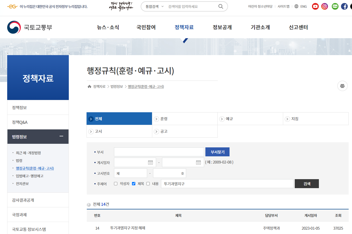 2. 오른쪽 상단 메뉴에서 정책자료 탭 아래 법령정보 - 행정규칙을 클릭해서 들어가줍니다.