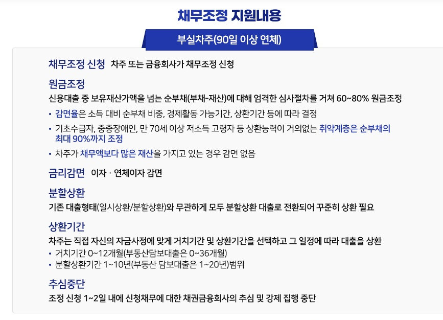 지원 대상 채무는 보유 자산에서 채무를 뺀 순부채에 대해서 60~최대90%까지 원금 조정을 받을 수 있다고 합니다.