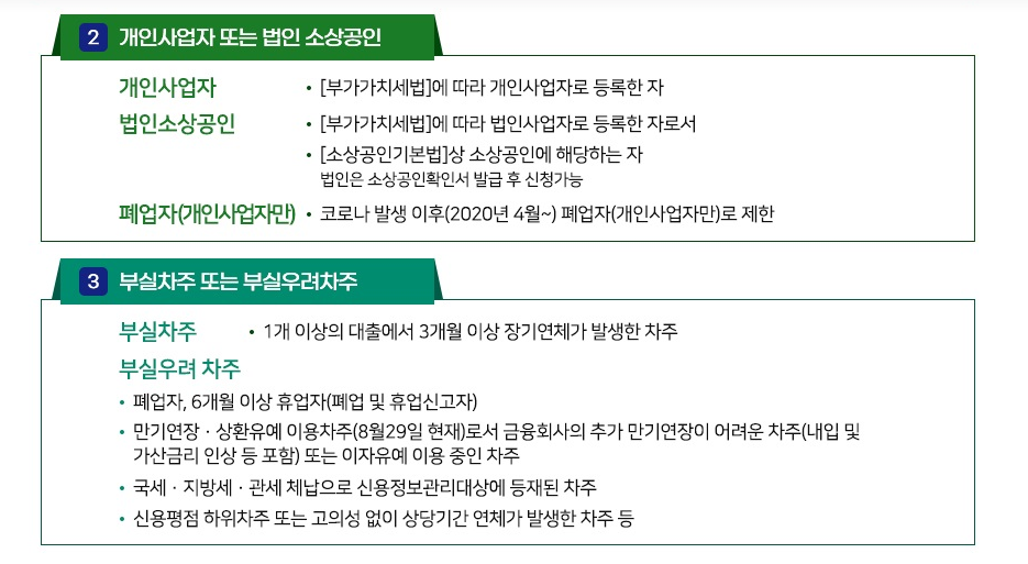 2020년 4월부터 2023년 11월 사이에 사업을 영위한 분들 중 지원제외업종인 부동산임대업 등의 업종에 해당되지 않는 분들이 혜택을 받으실 수 있습니다. 대출에서 연체가 발생한 부실차주 뿐만 아니라 폐업자, 6개월이상 휴업신고자 등 부실우려차주도 해당이 됩니다.
