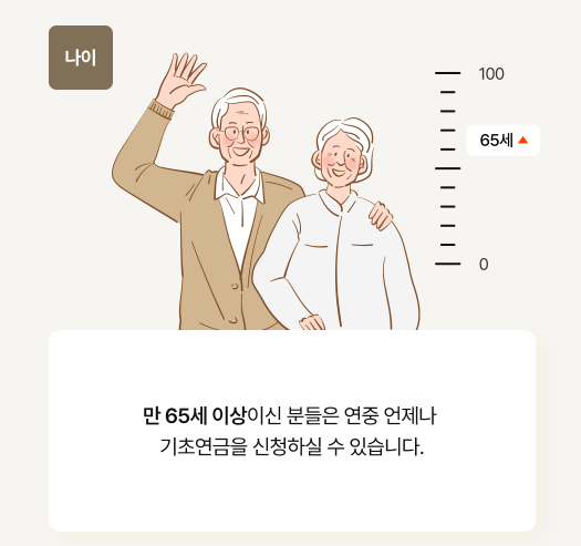 - 신청기간 : 연중 언제든지 신청가능. 만 65세 생일이 속하는 달의 1개월 전부터 신청가능.