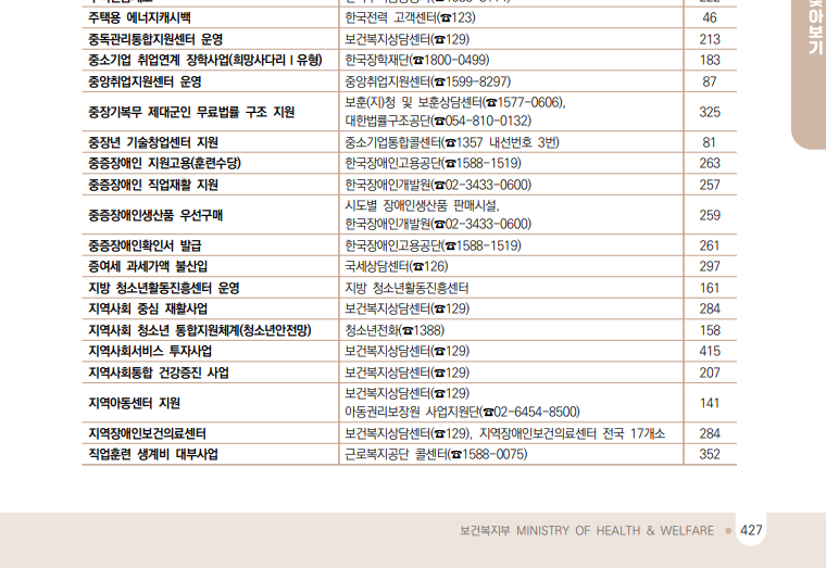 이 목록은 정부에서 발간한 나에게 힘이 되는 복지서비스 책자에 있는 내용입니다. 사업명을 확인하신 후 본인에게 해당될 것 같은 사업은 해당 명칭을 포털사이트에 조회하여 자세하게 알아보시면 됩니다. 목차에 나와있는 문의처 전화번호를 활용하셔도 도움 되실 거예요.