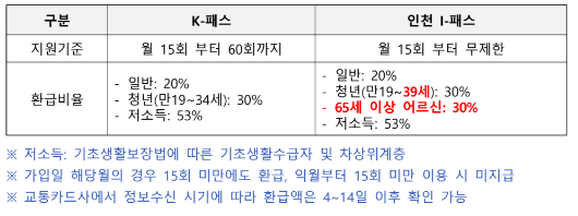 K-패스는 지원 회수가 월 15회부터 60회까지만 해당되는데 인천 I-패스는 월 15회부터 무제한 지원된다고 합니다. 환급 비율도 청년 범위가 39세로 늘어나고, 65세 이상 어르신도 30% 환급 대상이 되기 때문에 K-패스보다 환급대상자가 훨씬 더 늘어납니다.